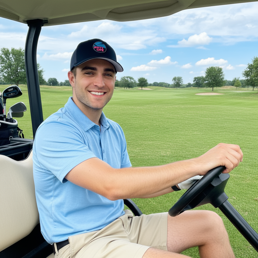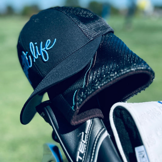 Putt Life Neon Blue Script Trucker Hat BLACK
